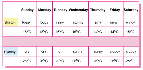 | 10 | Click on the correct answer.![]() Q: What temperature will it be next Friday in Sydney? A: It will be __________. |