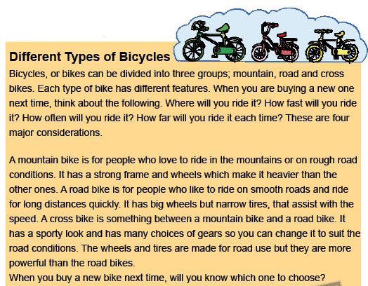 | X 11 | Click on the correct answer.![]() Q: Describe what a cross bike looks like? A: It _______________. |