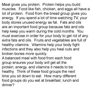 | 7 | Click on the correct answer. ![]() Q: What does eating fruit and vegetables help your body do? A: It helps my body _____________. |